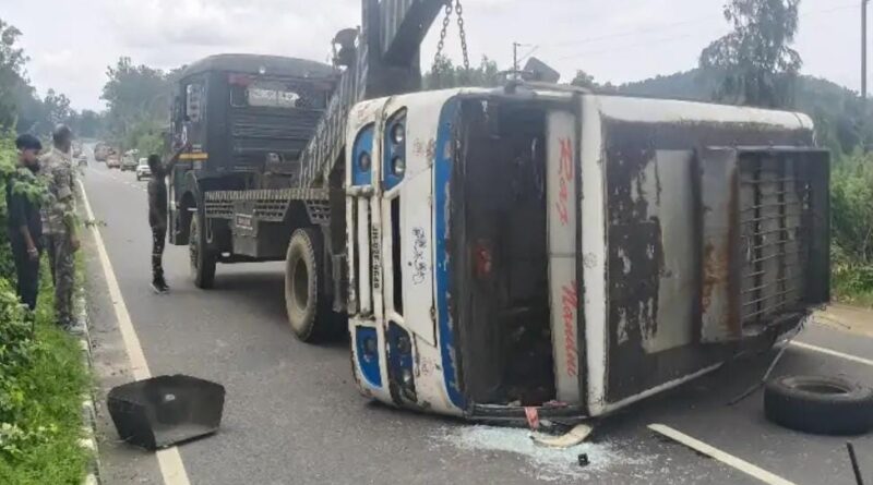 टायर फटने के बाद डिवाइडर से टकराई बस,सड़क पर पलटी,चार घायल,चालक फरार