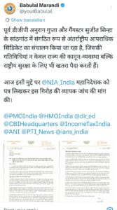 राँची।झारखण्ड के नेता प्रतिपक्ष और पूर्व मुख्यमंत्री बाबूलाल मरांडी ने राष्ट्रीय जांच एजेंसी (NIA) को पत्र लिखा है।जिसमें उन्होंने झारखण्ड के पूर्व डीजीपी अनुराग गुप्ता और जेल में बंद गैंगस्टर सुजीत सिन्हा गिरोह के बीच कथित सांठगांठ की व्यापक जांच की मांग की है।