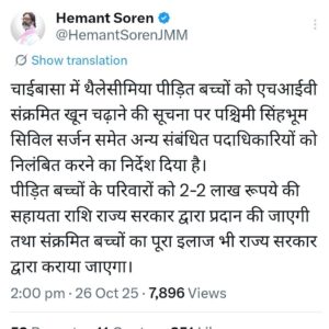 राँची/चाईबासा।झारखण्ड के चाईबासा में स्वास्थ्य विभाग में लापरवाही का एक चौंकाने वाला मामला सामने आया है। यहां के सदर अस्पताल में ब्लड ट्रांसफ्यूजन (ब्लड चढ़ाना) के बाद थैलेसीमिया पीड़ित 5 बच्चे HIV पॉजिटिव पाए गए हैं।अब इस मामले में मुख्यमंत्री हेमंत सोरेन ने एक्शन लेते हुए सिविल सर्जन समेत संबंधित अधिकारियों को निलंबित कर दिया है। साथ ही उन्होंने पीड़ित बच्चों के परिवारों को 2-2 लाख रुपए की आर्थिक सहायता देने का निर्देश दिए हैं।इसके अलावा संक्रमित बच्चों का पूरा इलाज राज्य सरकार की ओर से कराने की घोषणा की है। मुख्यमंत्री ने कहा, ‘बच्चों की जिंदगी से खिलवाड़ किसी भी सूरत में बर्दाश्त नहीं किया जाएगा, दोषियों पर कड़ी कार्रवाई होगी।’साथ ही झारखण्ड हाईकोर्ट ने इस मामले में राज्य स्वास्थ्य सचिव और जिला सिविल सर्जन से रिपोर्ट मांगी है।