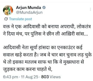 इधर पुलिस एनकाउंटर में सूर्या हांसदा के मारे जाने के बाद सवाल उठ रहे हैं। कल सूर्या के परिजनों ने एनकाउंटर को फर्जी बताया था और राजनीतिक साजिश के तहत सूर्या की हत्या का आरोप लगाया था। अब मामले में प्रदेश भाजपा भी खुलकर सामने आ गई है। भाजपा नेताओं ने मामले में राज्य सरकार और पुलिस पर कई गंभीर सवाल उठाए हैं।राज्य के पूर्व मुख्यमंत्री अर्जुन मुंडा ने सूर्या हांसदा के एनकाउंटर पर अपने सोशल मीडिया प्लेटफार्म पर पोस्ट लिखा है।जिसमें उन्होंने बड़ी बात लिखी है. अर्जुन मुंडा ने पोस्ट में लिखा है कि “वक्त ने एक आदिवासी को बनाया अपराधी, लोकतंत्र ने दिया मंच, पर पुलिस ने छीन ली आखिरी सांस…आदिवासी आदिवासी नेता सूर्या हांसदा का एनकाउंटर कई सवाल खड़े करता है। जब वे चार बार चुनाव लड़ चुके थे तो इसका मतलब साफ था कि वे मुख्यधारा से जुड़कर काम करना चाहते थे, लेकिन पुलिस द्वारा जिस हिसाब से कार्रवाई की गई है, वह कई तरह के संदेह खड़ा करता है।”
