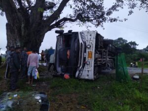 राँची।जिले के नामकुम थाना क्षेत्र में जमशेदपुर से राँची आ रहीं सवारी बस अनियंत्रित होकर सड़क पर पलट गई।दुर्घटना थाना क्षेत्र लदनापीढी में गुरुवार शाम में हुई है।बस में सवार एक दर्जन से अधिक यात्री को चोट आई है। जिसमें तीन की हालत गंभीर बनी हुई है।सूचना पर पहुंचे थाना प्रभारी सह इंस्पेक्टर मनोज कुमार ने सभी घायलों को अस्पताल भिजवाया।