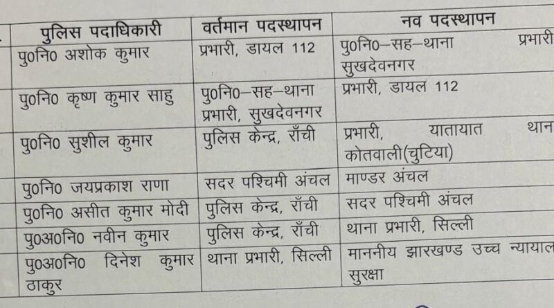 राँची।राजधानी राँची में तीन थाना में प्रभारी सहित 7 पुलिस पदाधिकारी का पदस्थापन किया गया है। राँची के एसएसपी राकेश रंजन के निर्देश से रविवार को जारी जिला आदेश में सुखदेवनगर के थानेदार सह पुलिस इंस्पेक्टर कृष्ण कुमार साहू का तबादला कर दिया गया है। उन्हें डायल 112 का प्रभारी बनाया गया है। वहीं, पुलिस लाइन में पदस्थापित पुलिस इंस्पेक्टर अशोक कुमार को सुखदेवनगर का नया थानेदार बनाया गया है। पुलिस इंस्पेक्टर सुशील कुमार को कोतवाली यातायात थाना (चुटिया) का और सब इंस्पेक्टर नवीन कुमार को सिल्ली का प्रभारी बनाया गया है। सिल्ली के प्रभारी दिनेश ठाकुर को झारखण्ड उच्च न्यायालय सुरक्षा व्यवस्था में लगाया गया है।सदर पश्चिमी अंचल के इंस्पेक्टर जयप्रकाश राणा को मांडर अंचल, पुलिस केंद्र से असीत कुमार मोदी को सदर पश्चिमी अंचल का इंस्पेक्टर बनाया गया है।
