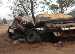 गुमला।झारखण्ड के गुमला जिले में बुधवार देर रात सिलम बायपास मोड़ के पास एक भीषण सड़क हादसे में ट्रेलर चालक की मौत हो गई। बताया गया कि रात करीब एक बजे अनियंत्रित ट्रेलर सड़क किनारे पेड़ से जा टकराया। टक्कर इतनी जोरदार थी कि आसपास के लोगों की नींद खुल गई।जब लोग बाहर निकले तो देखा कि ट्रेलर पेड़ से भिड़ा हुआ है और उसमें आग लगी हुई है। आग की लपटें तेजी से उठ रही थीं। प्रत्यक्षदर्शियों के अनुसार टक्कर के तुरंत बाद ट्रेलर के केबिन से धुआं निकलने लगा और देखते ही देखते आग ने विकराल रूप ले लिया।