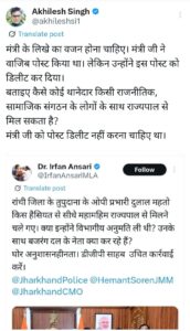 राँची।झारखण्ड के स्वास्थ्य मंत्री डॉ इरफान अंसरी ने राजधानी राँची के तुपुदाना ओपी प्रभारी को निशाने पर लिया है।उन्होंने सोशल मीडिया पर पोस्ट भी किया।लेकिन कुछ देर बाद फिर पोस्ट को डिलीट कर दिए। दरअसल,तुपुदाना ओपी प्रभारी दुलाल महतो एक प्रतिनिधिमंडल में शामिल होकर राज्यपाल से मिलने पहुंचे थे।इस पर स्वास्थ्य मंत्री ने फोटो शेयर करते हुए लिखा है कि “राँची जिला के तुपुदाना के ओपी प्रभारी दुलाल महतो किस हैसियत से सीधे महामहिम राज्यपाल से मिलने चले गए। क्या इन्होंने विभागीय अनुमति ली थी? उनके साथ बजरंग दल के नेता क्या कर रहे हैं? घोर अनुशासनहीनता। डीजीपी साहब उचित कार्रवाई करें।”उसके बाद ये पोस्ट सोशल मीडिया में बड़ी तेजी से वायरल होने लगा।बड़ी तेजी से खबर चलने लगा।कुछ देर बाद मंत्री जी का ये एक्स और फेसबुक से डिलीट हो गया।